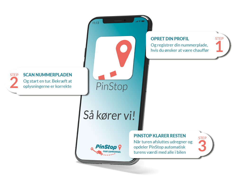 Med Pinstop er det slut med de akavede samtaler om betaling for at køre sammen. Det eneste du skal gøre, er at scanne chaufførens nummerplade og så er din tur allerede i gang. Både passager og chauffør skal begge have en profil hos PinStop. Mens I kører udregner PinStop automatisk turens værdi ud fra kørte antal km. ganget med statens takst for kørselsfradrag. Beløbet bliver delt ligeligt mellem alle i bilen.